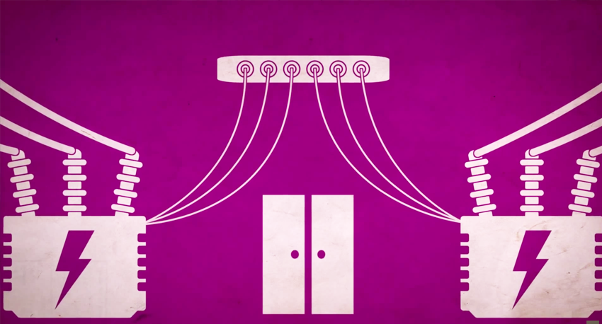 Electricity is transferred from power stations to consumers over long distances through the wires and cables of the power companies. When a current flows through a wire, a bit of energy is lost in the form of heat. The higher the current, the more energy is lost. To reduce these losses, the power companies transmit electricity at a low current, but this requires a high voltage.
